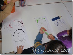 και όταν όλοι τελείωσαν φτιάξαμε με αυτά ένα βιβλίο όπου κόψαμε το κάθε πρόσωπο σε τρία κομμάτια έτσι ώστε να μπορούμε, γυρίζοντας τις σελίδες να φτιάχνουμε αστείες και διαφορετικές φάτσούλες επιλέγοντας κάθε φορά διαφορετικά χαρακτηριστικά.