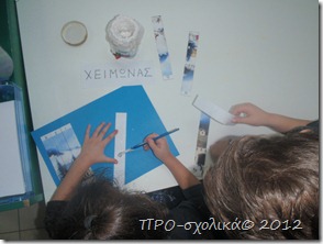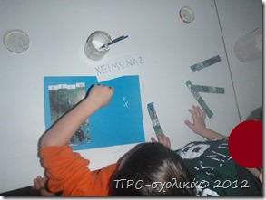Δεν τους είπα τη θεματολογία των εικόνων. Ένας από κάθε ομάδα θα ήταν εκείνος που θα κολλούσε. Στόχος: Να ανακαλύψουν τι δείχνει η εικόνα τους, συνθέτοντας τη λέξη “ΧΕΙΜΩΝΑΣ” (την τελευταία τους την είχα δώσει γραμμένη σε χαρτί) και φυσικά να το κάνουν πριν τις άλλες ομάδες;).