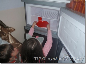 Στα δικά μου παιδιά τράβηξε το ενδιαφέρον η παγωμένη λίμνη και οι άνθρωποι που περπατούσαν επάνω της. Οπότε βρήκαμε ευκαιρία να πειραματιστούμε με το νερό και να δούμε τι παθαίνει όταν ο καιρός είναι πολύ κρύος. Για αρχή βάλαμε στην κατάψυξη νερό αλλά και στο ψυγείο.