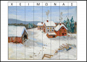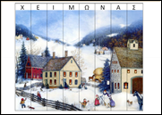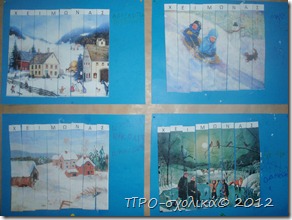 Ξεκινάμε το πρόγραμμά μας με τον Χειμώνα μια και πολύ λίγα καταφέραμε να κάνουμε πριν τις γιορτές για το θέμα. Και ενώ συνήθως δείχνουμε στα παιδιά πίνακες ή εικόνες χειμωνιάτικες τις οποίες περιγράφουμε και συζητάμε είπα να το κάνω πιο ενδιαφέρον αυτό σαν δραστηριότητα. Έδωσα στα παιδιά τους παρακάτω πίνακες κομμένους και τους χώρισα σε ομάδες (το ιδανικό για να υπάρξει σωστή αλληλεπίδραση είναι ως τρία παιδιά ανά ομάδα).