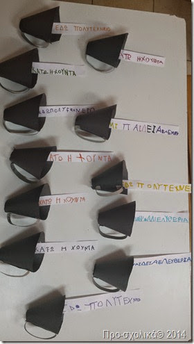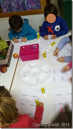 Τα νήπια έπρεπε να αντιγράψουν τις λέξεις από τον πίνακα, ενώ τα προνήπια να τις αντιστοιχίσουν (και να τις κολλήσουν).